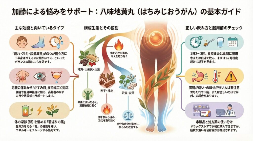 🐢 八味地黄丸ってどんな漢方? 八味地黄丸(はちみじおうがん)は、体を温めて水分代謝を改善し、「腎(じん)」の機能(生命力・泌尿器・生殖器など)を補う漢方薬です。 特に、「下半身は冷えるのに、顔はほてる」 というようなバランスの崩れや、加齢による機能低下(疲れやすさ、目のかすみ)によく使われます。別名「若返りの薬」とも呼ばれることがあります。