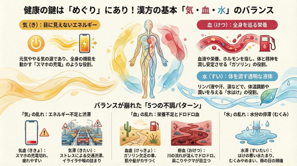 - 漢方では**「気(エネルギー)・血(栄養)・水(水分)」**のバランスを重視します。