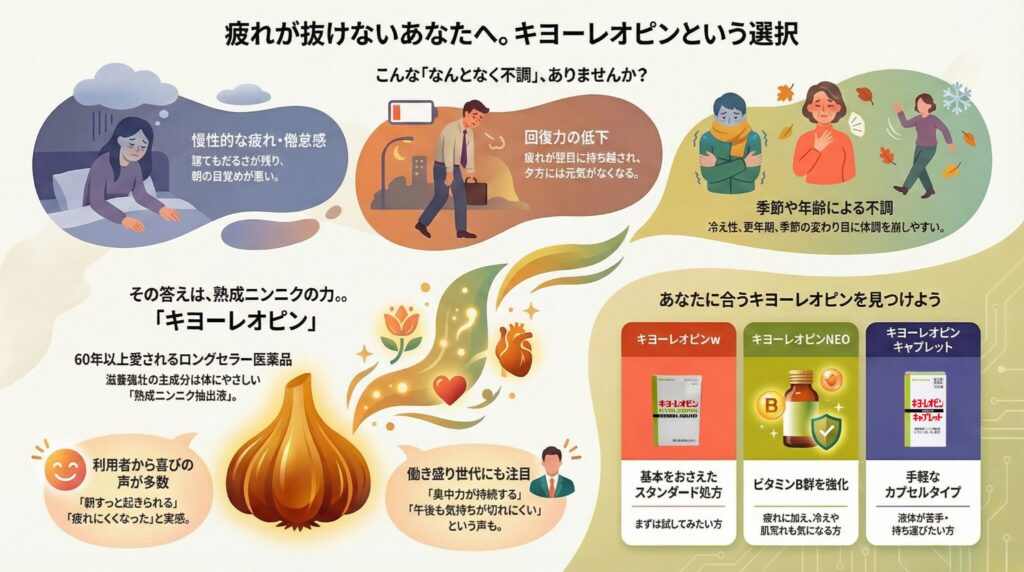 Kyoleopin is a basic model of a liquid type that has been loved for many years for the purpose of nourishing and relieving fatigue, centering on an aged garlic extract. It is processed to be gentle on the stomach and odorless, so it can be taken daily without worry.