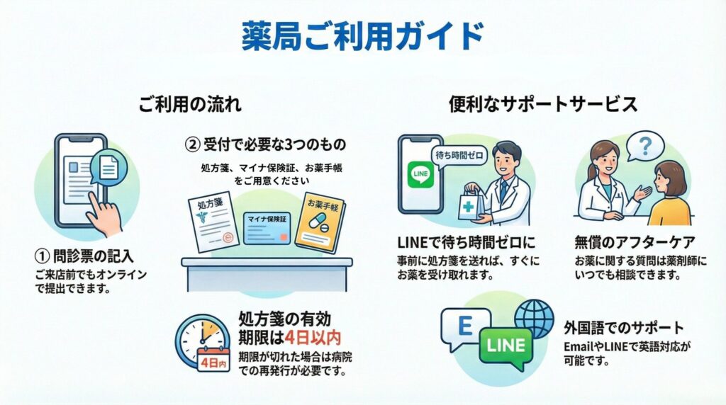 *If you would like to consult with a pharmacist regardless of whether you have a prescription or not, please use our “The Family Pharmacist ” service. In addition to being able to consult with a pharmacist anytime via official LINE, email, or phone, it is also possible to consolidate prescription drugs prescribed at multiple clinics and hospitals into a single medication book(okusuri techo).