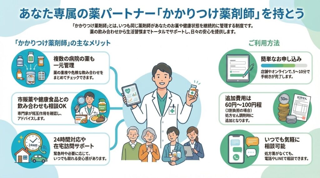 かかりつけ薬剤師は、毎回同じ薬剤師が継続してあなたを担当します。これにより、薬の飲み合わせや副作用のチェックはもちろん、生活習慣や体調の変化までをトータルにサポートできます。